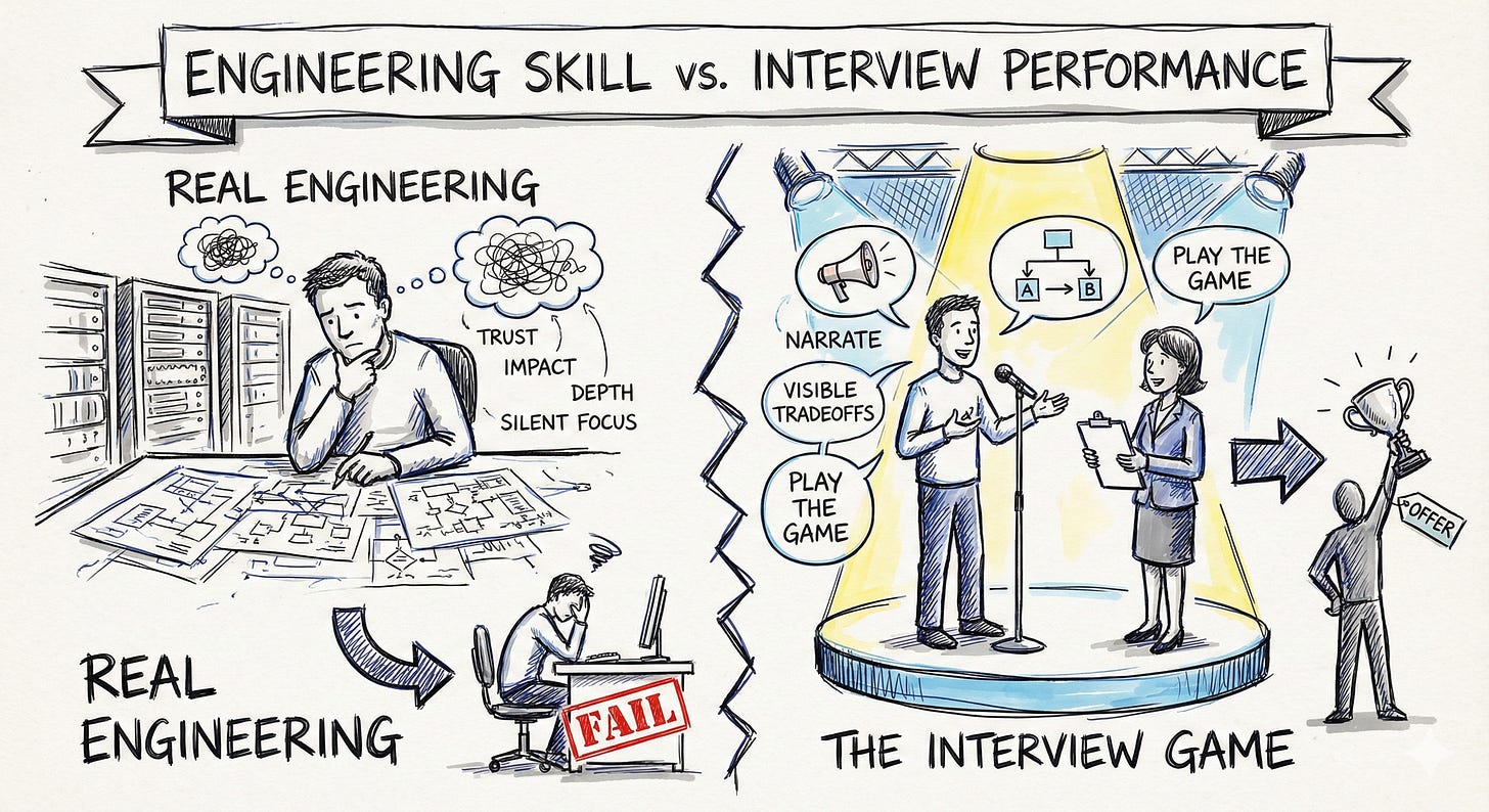 I see engineers failing interviews who are genuinely good at their jobs. The people teams depend on. The ones you trust in production incidents and trust their feedback in design reviews